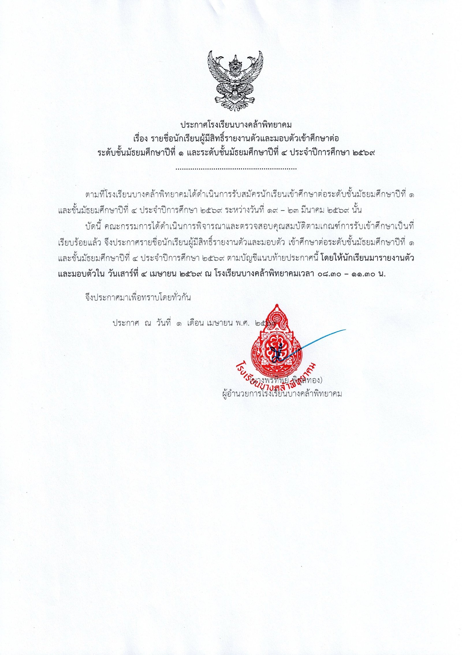 ประกาศ โรงเรียนบางคล้าพิทยาคม สำนักงานเขตพื้นที่การศึกษามัธยมศึกษาฉะเชิงเทรา เมื่อวันที่ : 7 มี.ค. 2568 |